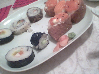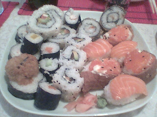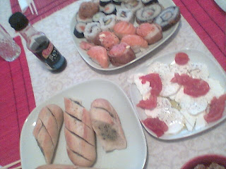 sushi! do take away do restaurante OSAKA, em Telheiras uma sobremesa improvisada sob a égide do chapéu verde: gelatina Koala, iogurte de soja com pedaços de frutos silvestres e joaninha de chicalate! yammy! queijinho fresco com tomatini, pãozinho de alho made in Lider e uma vinhaça a acompanhar